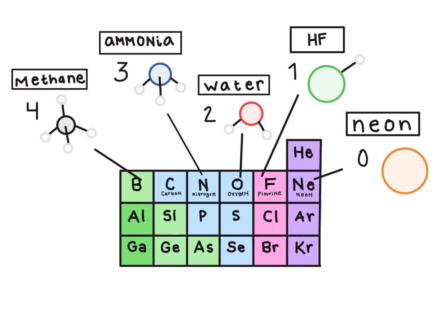 So oxygen, in the 6th position, likes to make bonds with two hydrogens to make water. I see the pattern you’re talking about: 6 + 2 = 8. Why eight?
