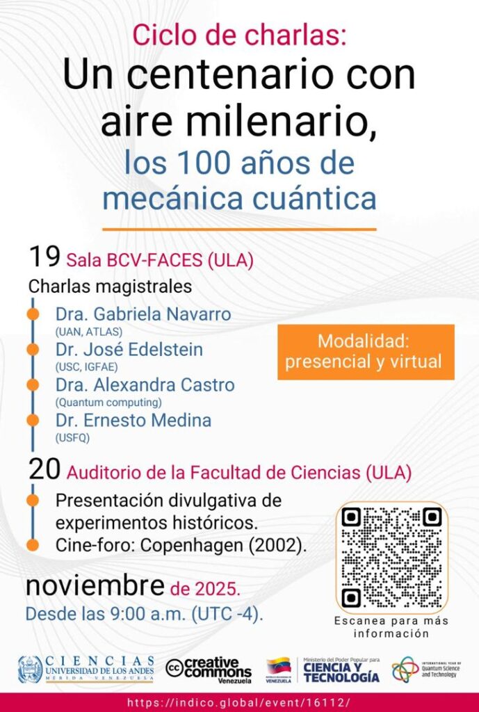 En el marco de la proclamación de 2025 como el Año Internacional de la Ciencia y la Tecnología Cuánticas por la UNESCO, la Facultad de Ciencias de la Universidad de Los Andes (ULA) organiza una jornada conmemorativa titulada “Un centenario con aire milenario: los 100 años de la Mecánica Cuántica”, que se celebrará los días 19 y 20 de noviembre de 2025.