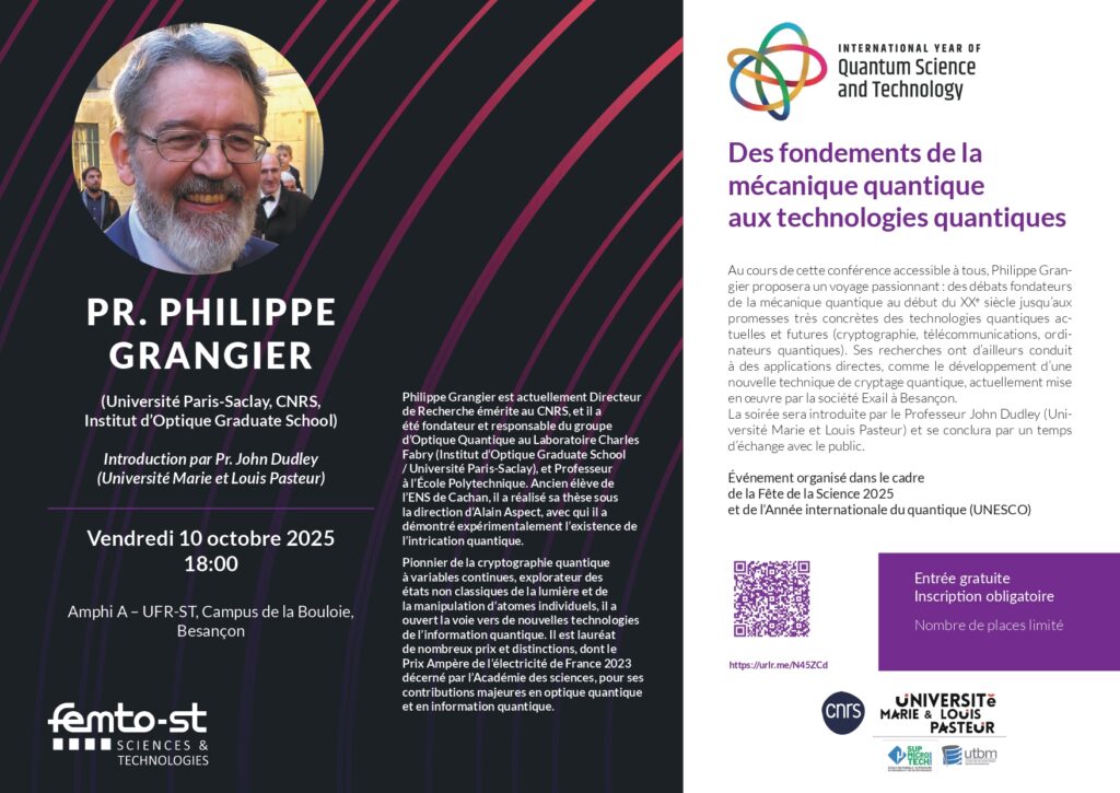 Au cours de cette conférence accessible à tous, Philippe Grangier proposera un voyage passionnant : des débats fondateurs de la mécanique quantique au début du XXᵉ siècle jusqu’aux promesses très concrètes des technologies quantiques actuelles et futures (cryptographie, télécommunications, ordinateurs quantiques). Ses recherches ont d’ailleurs conduit à des applications directes,comme le développement d’une nouvelle technique de cryptage quantique, actuellement mise en œuvre par la société Exail à Besançon.