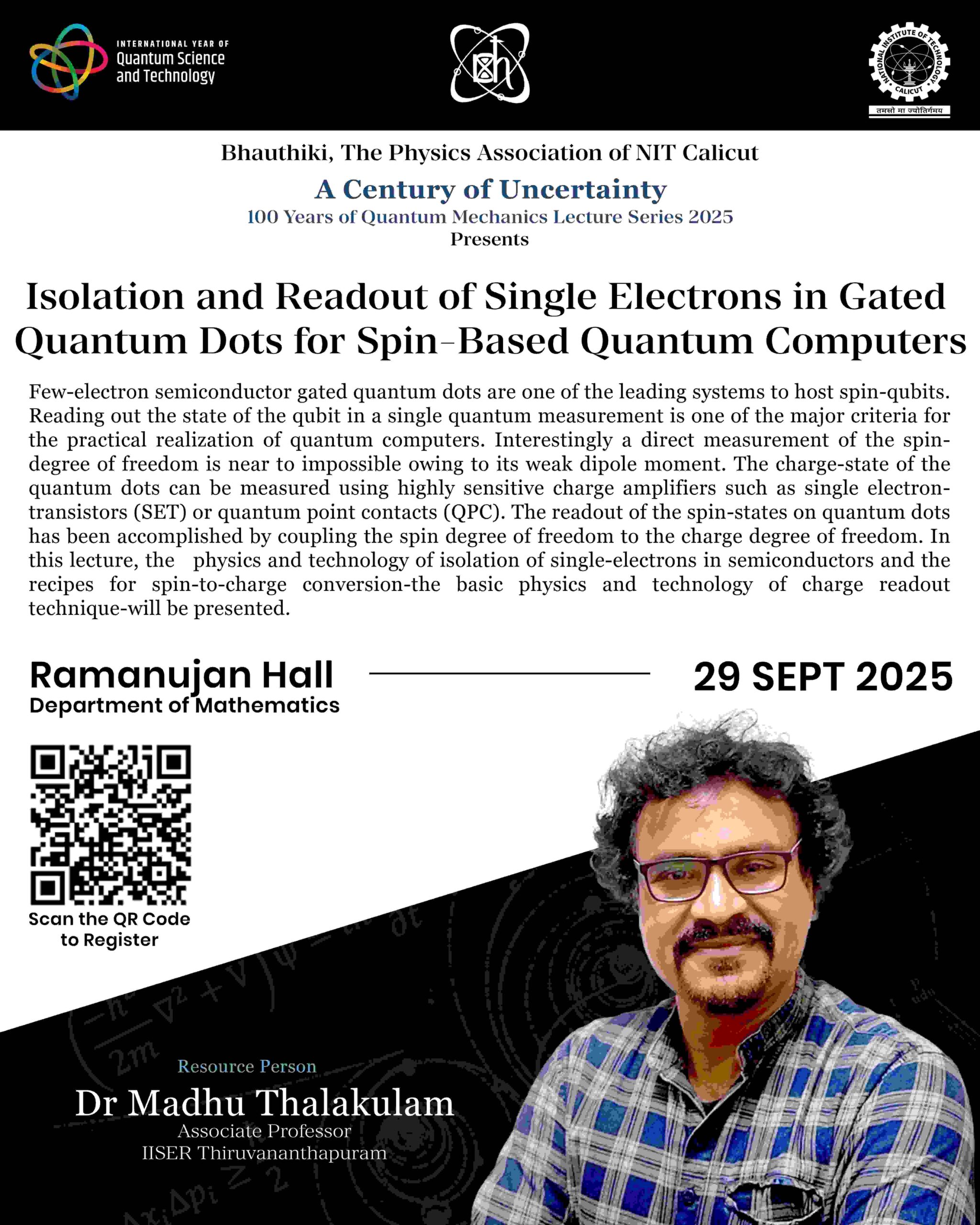 As part of A Century of Uncertainty—Lecture Series 2025, commemorating 100 years of quantum mechanics, Bhauthiki—The Physics Association of NIT Calicut—organized an invited talk by Dr. Madhu Thalakulam, Associate Professor, IISER Thiruvananthapuram.