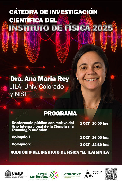 Este año tendremos a la Dra. Ana María Rey como ponente invitada en la cátedra del Instituto de Física de San Luis Potosí. La Dra. Rey impartirá una conferencia pública, además de dos conferencias adicionales de carácter más especializado los días 1 y 2 de octubre.