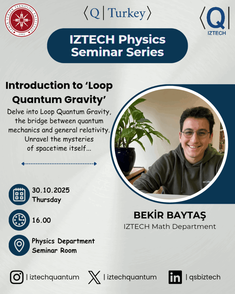 The IZTECH Quantum community is pleased to launch this semester’s Physics Seminar Series with an engaging talk on Loop Quantum Gravity—a theoretical framework that aims to understand the fabric of the universe at the quantum level. The seminar will be delivered by Dr. Bekir Baytas, a faculty member of the Department of Mathematics at İzmir Institute of Technology (IZTECH). In this talk, Dr. Baytas will introduce the fundamental ideas of Loop Quantum Gravity and discuss how this theory challenges our conventional understanding of space and time.