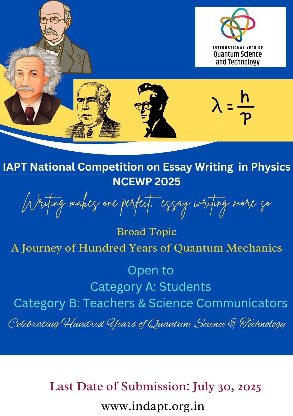 In January 2025, we launched the IAPT National Competition on Essay Writing in Physics NCEWP 2025. The theme of this competition was chosen as: A Journey of 100 Years of Quantum Mechanics. The competition is held in two phases. In the first phase, regional councils conduct regional essay competitions separately for students and teachers. The winning essays of the regional council competitions are forwarded to the national coordinator for final evaluation of essays and ranking. At the national level for this competition, 53 student entries and 21 teacher entries, i.e., a total of 73 entries, were received. Three judges/ examiners evaluated the essays. Prof. S. K. Joshi was the overall coordinator of NCEWP 2025. Prize-winning essays will be published as a collection of essays in e-book form. Winners were given prizes in the 39th Annual Convention of IAPT held in Goa from 5th October to 7th October 2025.