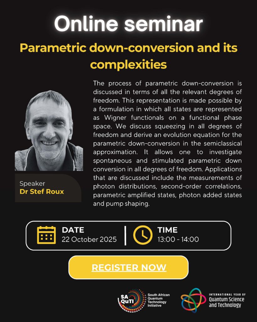 We are excited to welcome Dr. Stef Roux for an online seminar next week, where he will delve into the fascinating topic of “Parametric down-conversion and its complexities”—a Quantum Initiative event.