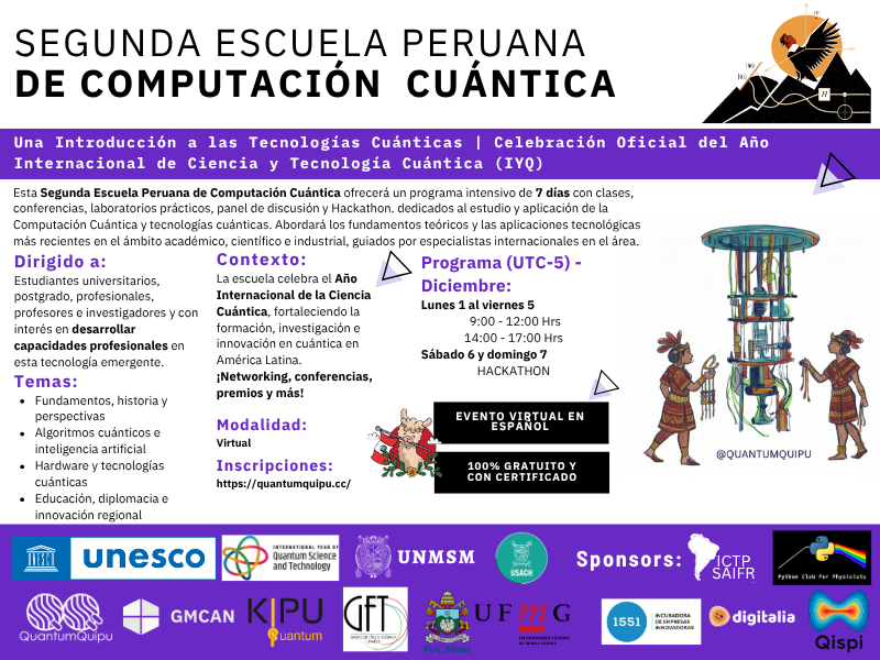 Evento académico intensivo de 7 días para desarrollar capacidades en tecnologías cuánticas. La actividad oficial de celebración del Año Internacional de la Ciencia y la Tecnología Cuántica ofrece una experiencia educativa de clase mundial. La escuela combina formación avanzada, investigación de frontera y diplomacia científica, con el objetivo de fortalecer el ecosistema cuántico en Perú y América Latina, impulsando a la región como protagonista de la revolución cuántica global.