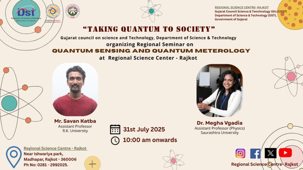 GUJCOST has curated a dynamic series of programs and outreach initiatives aimed at bringing quantum science and technology closer to students, schools, and STEM institutions across Gujarat, inspiring young minds and nurturing a future-ready scientific community through its Regional Science Centres. Through expert talks and hands-on activities, the program connects quantum with the community.