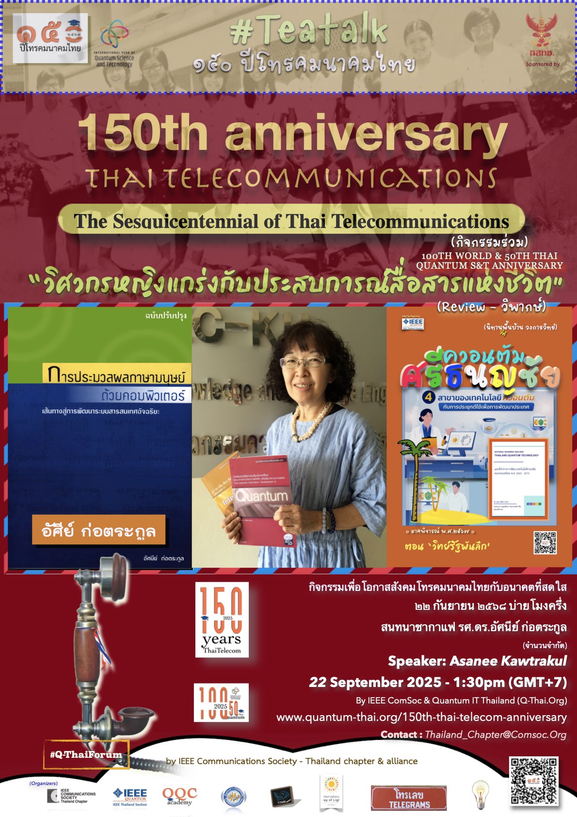 In this intimate mini-tea talk, she will reflect on 150 years of Thai telecommunications—from the establishment of the country’s first telegraph line in 1875, through AI, to today’s technological landscape—drawing from her lifetime of experiences. She will also emphasize responsible science communication. A recording of the session will be made publicly available following the event.