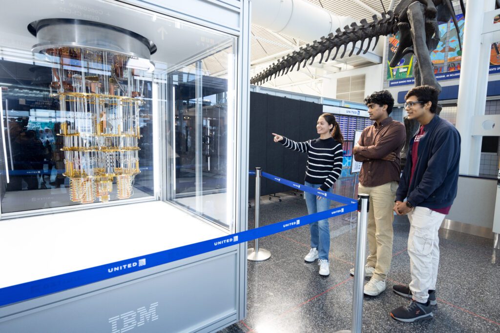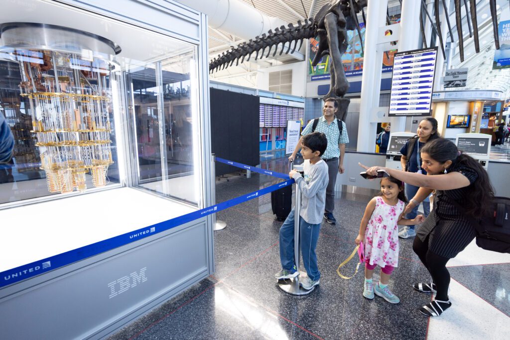 Eight-year-old Ishaan Jain, 8, and his sister Siya, 4, look at the inside of the IBM Quantum System One with Sunanda Prabhu Gaunkar, right, director of science for the STAGE center, and their parents, Anchal and Manish Jain, September 25, 2025. The IBM Quantum System One is a quantum computer that combines quantum science with traditional computing. It is on display at O’Hare Airport to highlight the role of Chicago and the Midwest as a central driver of US leadership in quantum technology. The exhibit is a collaboration between the University of Chicago’s Pritzker School of Molecular Engineering’s STAGE Center, IBM, and United Airlines. (photo by Anne Ryan)