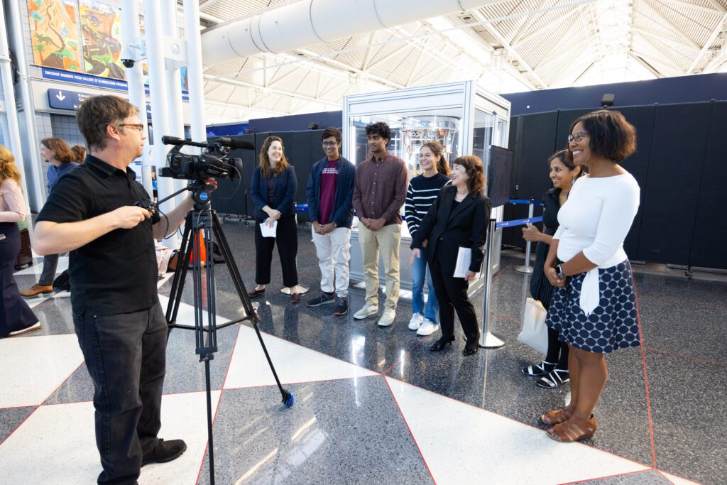 The STAGE Center staff poses in front of an exhibit of the inside of IBM Quantum System One, a quantum computer that combines quantum science with traditional computing. The computer is on display at O’Hare Airport to highlight Chicago and the Midwest’s role as a central driver of US leadership in quantum technology. Photo by Anne Ryan.
